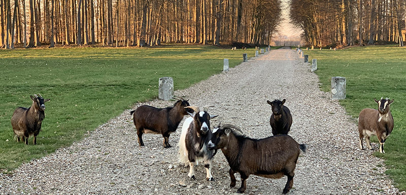 Il se peut qu’en vous promenant sur le domaine de Miromesnil, vous croisiez, perchée sur les rambardes du pont ou cheminant paisiblement sur les pelouses, une petite chèvre.