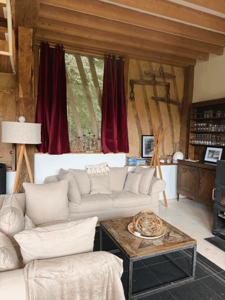 Le poêle à bois est prêt à ronronner dans le salon où les poutres apparentes jouent avec les grandes ouvertures.